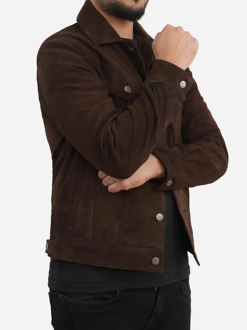 While this jacket is designed for men, the dark brown suede jacket womens trend continues to rise, and many women prefer styling suede trucker jackets in oversized or cropped looks. Inspired by fashion trends like the dark brown suede jacket cropped style, women often pair similar jackets with high-waisted jeans or skirts. A dark brown suede jacket outfit women style often includes neutral tones, boots, and layered accessories, proving the timeless appeal of suede across genders.
